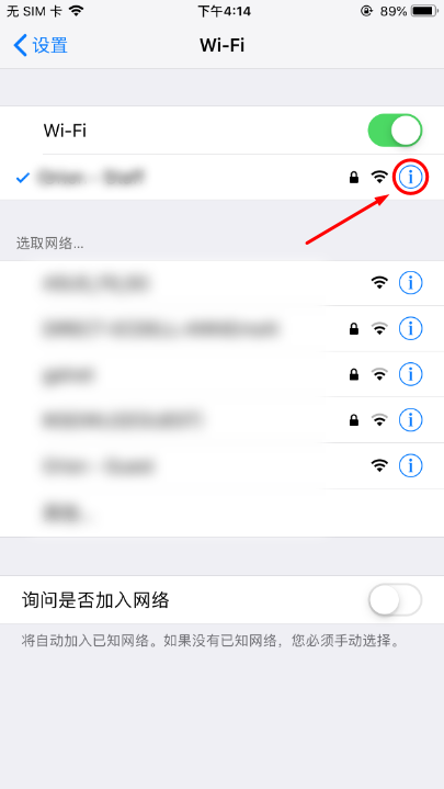 3、连接上可用的Wi-Fi网络后,然后点击Wi-Fi网给名称右方的【显示信息】按钮【字母i】。
