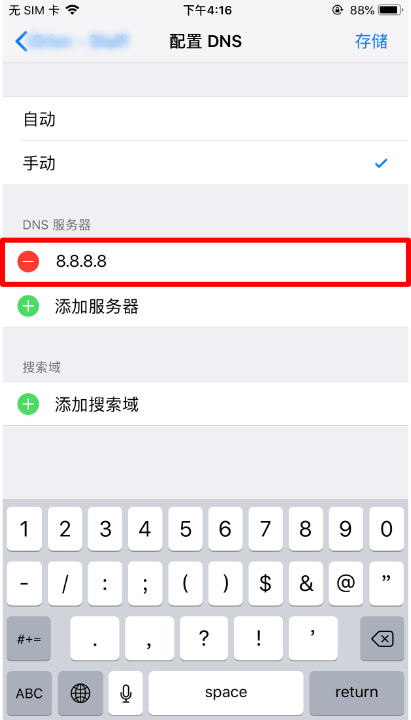 5、接下来在弹出的键盘上输入你需要改动的DNS数据,本例子中我们使用Google提供的8.8.8.8