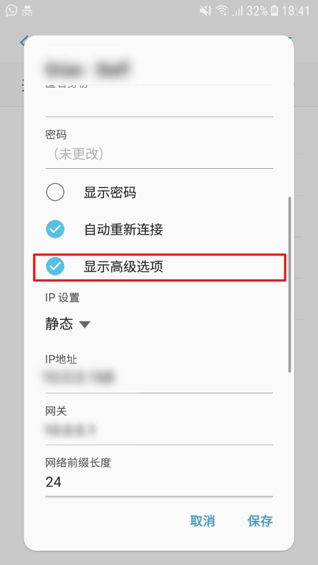 4、选择"显示高级选项"将IP设定改为静止。